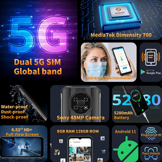 WP13 5G Rugged Cell Phones Unlocked,Rugged Smartphone Temperature Sensor 128GB ROM+8GB RAM 5280Mah Battery 48MP Triple Cameras 6.52-Inch Screen Nfc+Google Pay Global Version